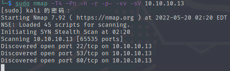 sudo nmap -T4 -Pn -n -r -p- -vv -sV 10.10.10.13