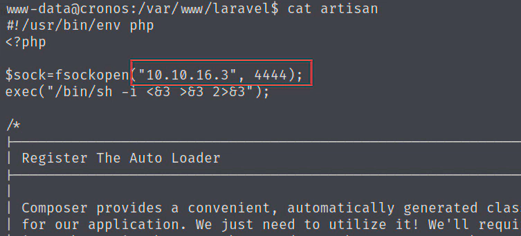 查看/var/www/laravel/artisan发现是反弹shell脚本,而www-data有该文件读写权限