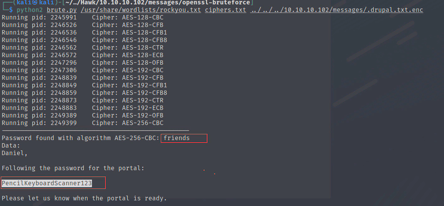 python2 brute.py /usr/share/wordlists/rockyou.txt ciphers.txt drupal.txt