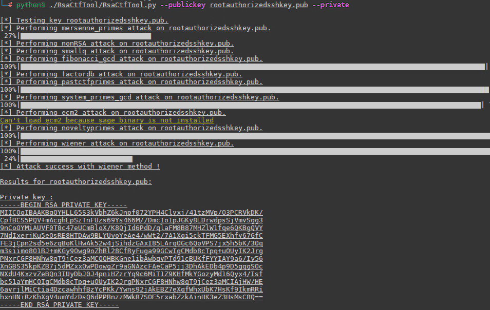 python3 ./RsaCtfTool/RsaCtfTool.py --publickey rootauthorizedsshkey.pub --private