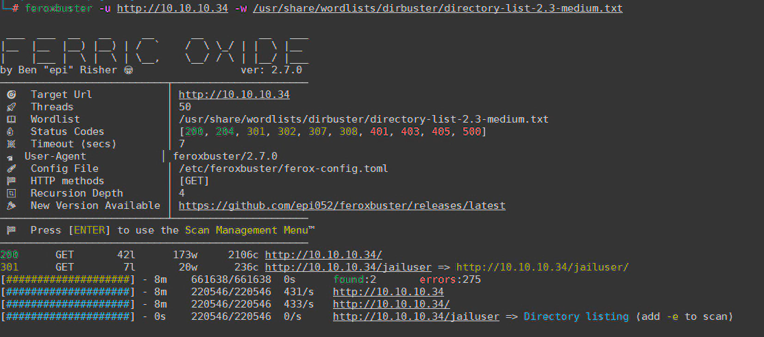 feroxbuster -u http://10.10.10.34 -w /usr/share/wordlists/dirbuster/directory-list-2.3-medium.txt