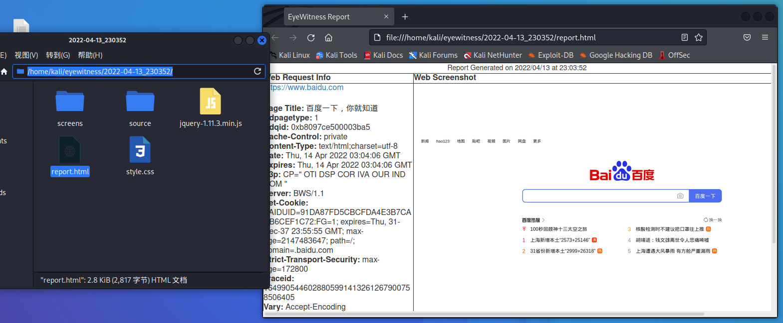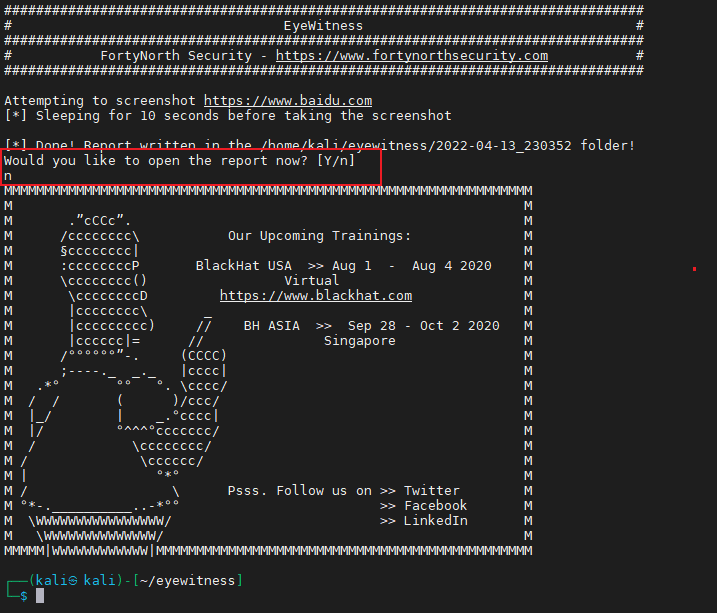 EyeWitness 将调用 selenium,它使用您系统上安装的实际浏览器(IceWeasel 或 Firefox)来截取屏幕截图。您不会看到浏览器弹出窗口,但它会在后台运行,并截取您提供的 URL 的屏幕截图,并生成简单的报告